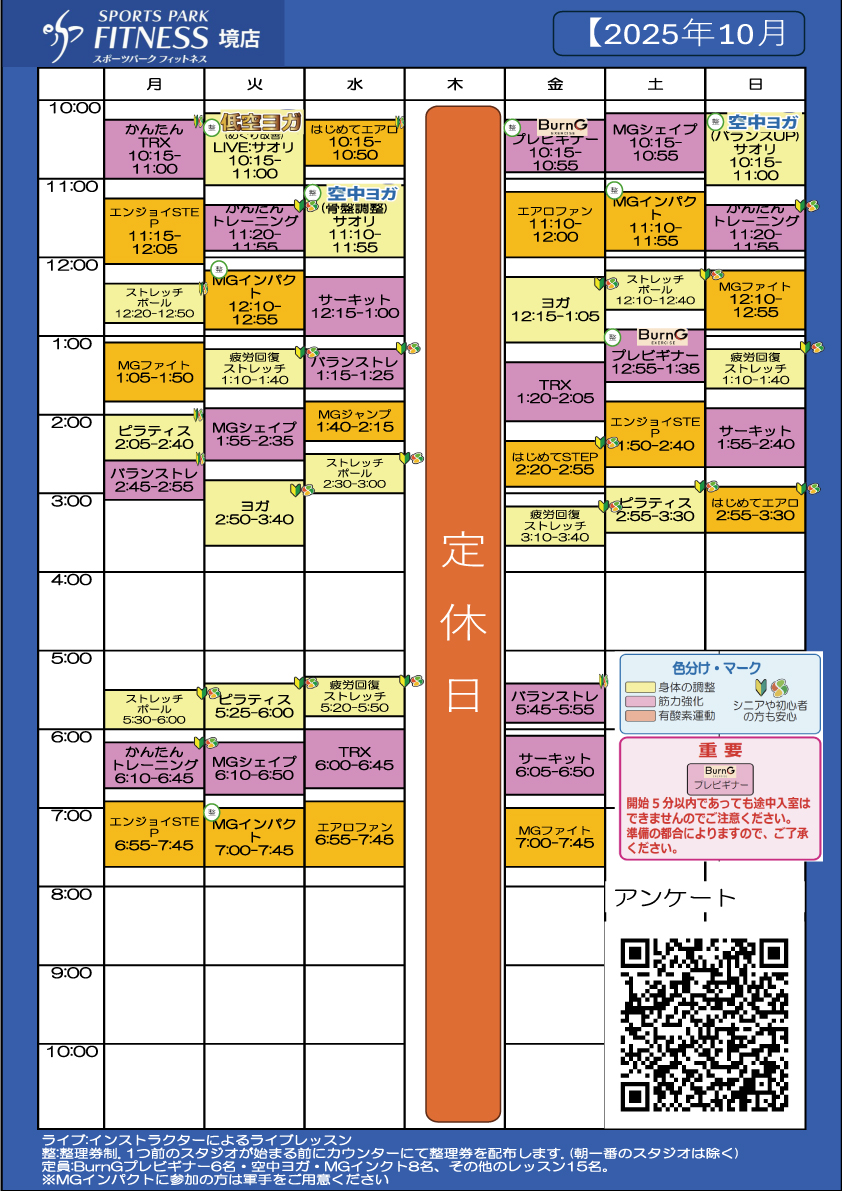 境店 境店10月のスタジオスケジュールのご案内です。 2025.10.01 Tweet Share この記事のタイトルとURLをコピーする 朝晩が涼しくなり、秋の気配が近づいてきました🍁 10月のスタジオスケジュールのご案内です(^0^)/ 過ごしやすい気候になってきました!夏を乗り越えた今、さらに楽しく頑張りましょう♪ Tweet Share